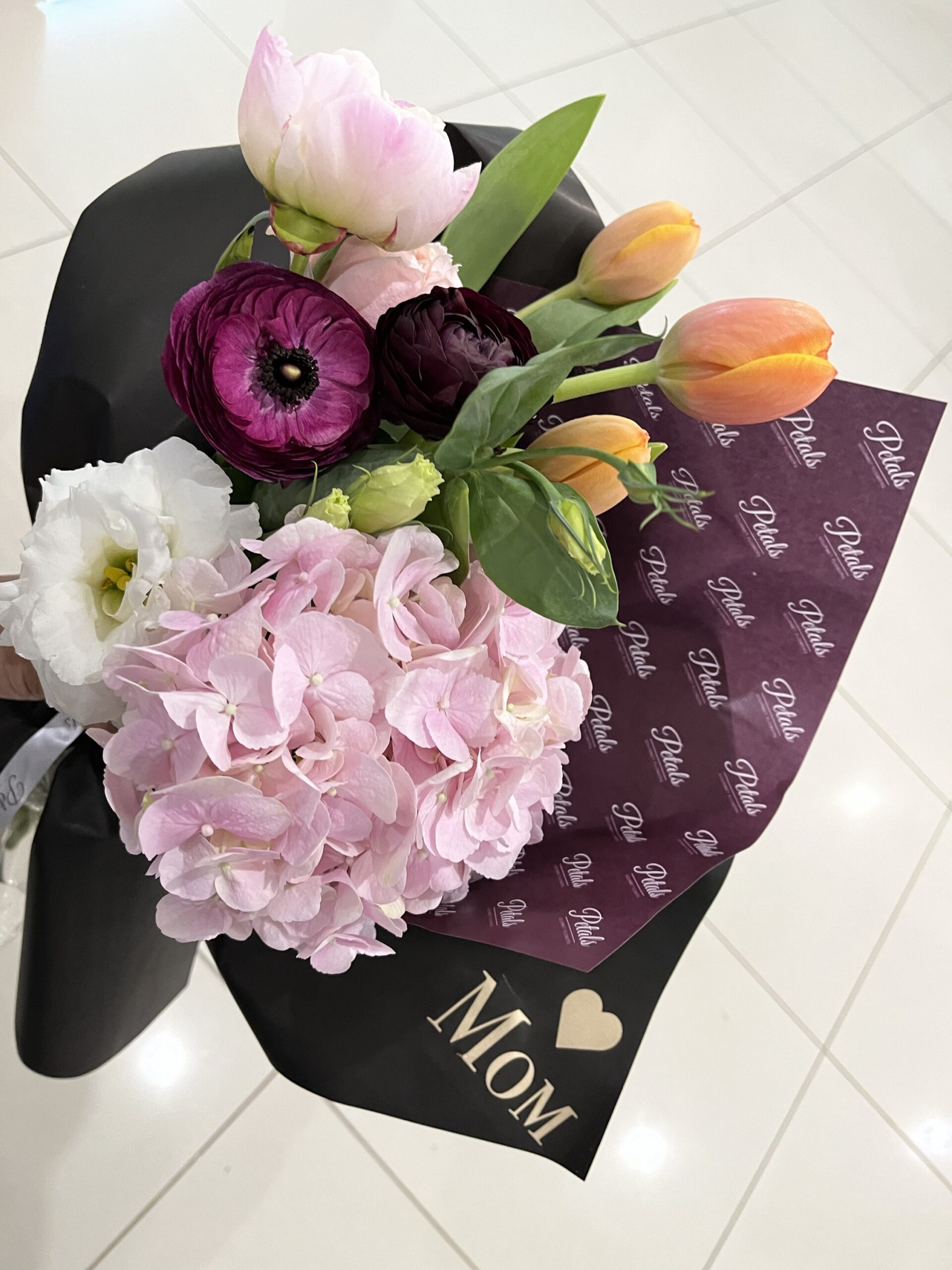 A wrapped bouquet with a selection of hydrangea, ranunculus, tulips , lisianthus and special rose